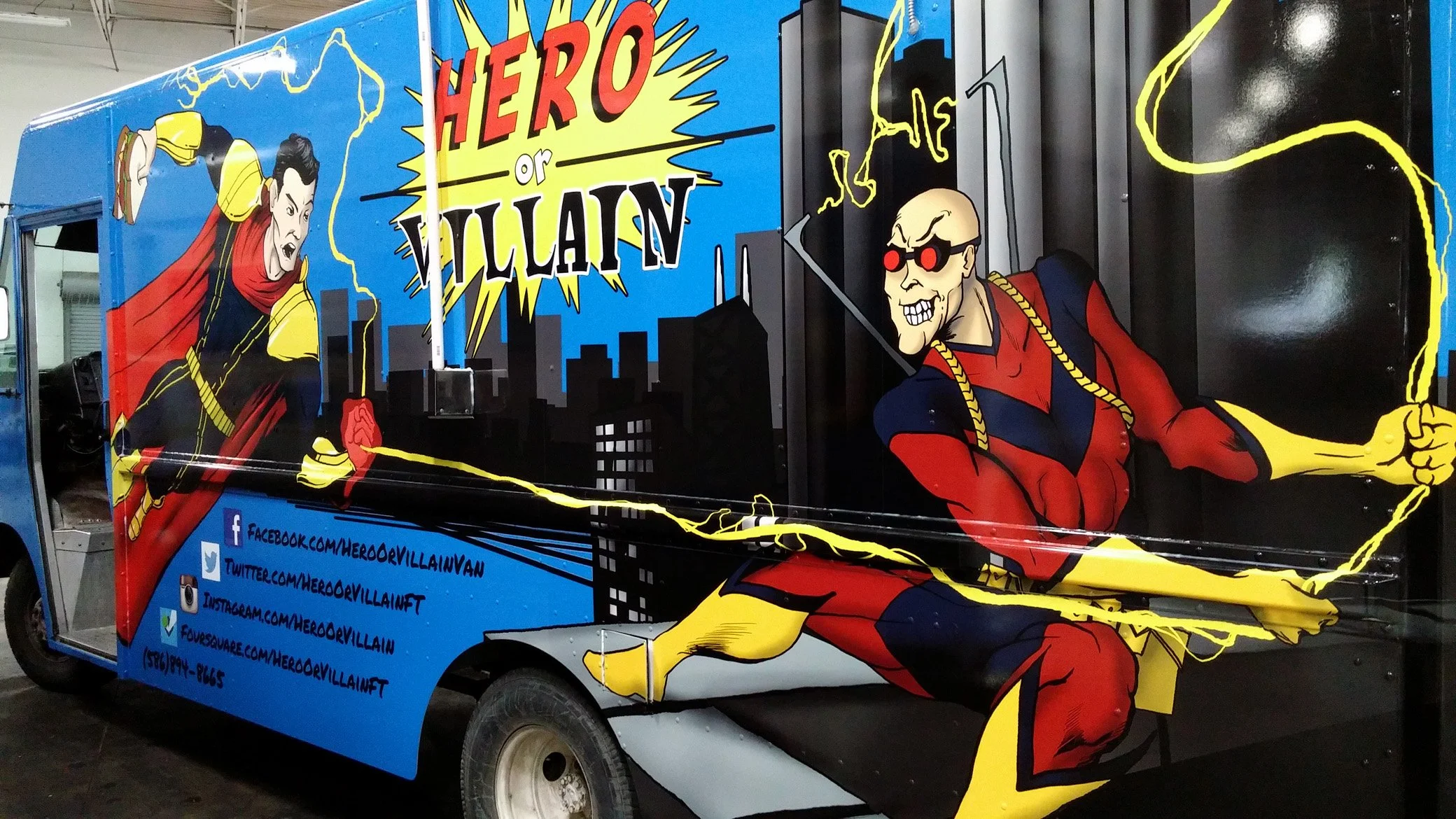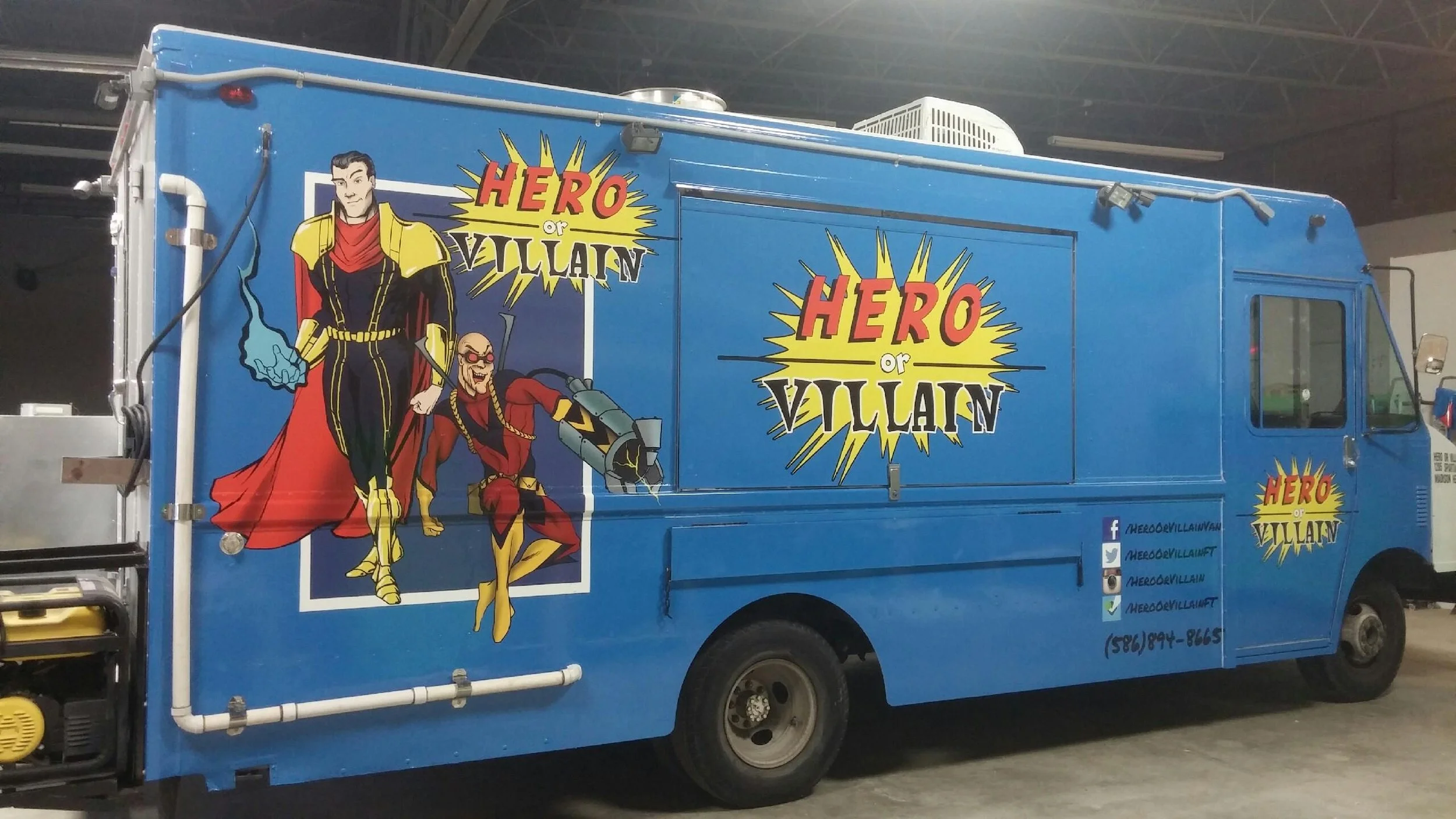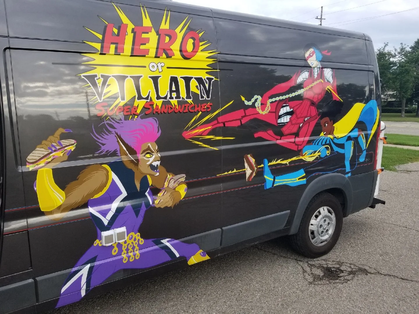 “Hero Or Villain” is a food truck based out of the Detroit area specializing in super-power themed sandwiches. I provided illustrations for their first truck and was asked to collaborate again for their second truck, “Sidekicks”. Eventually, assets from both trucks were consolidated into one as the “Sidekicks” vehicle was decommissioned.